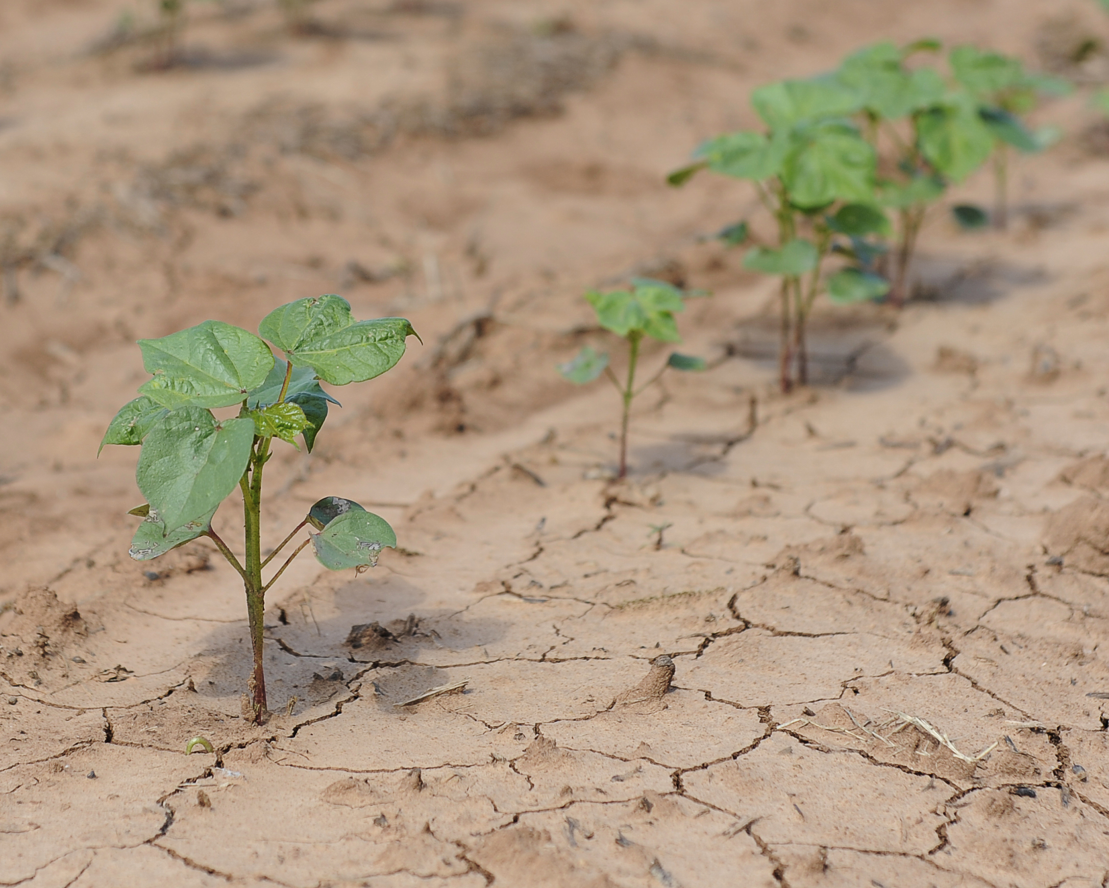 Young cotton plants emerge from cracked soil at the Dean Lee Research and Extension Center in May 2014. (Photo courtesy LSU AgCenter)