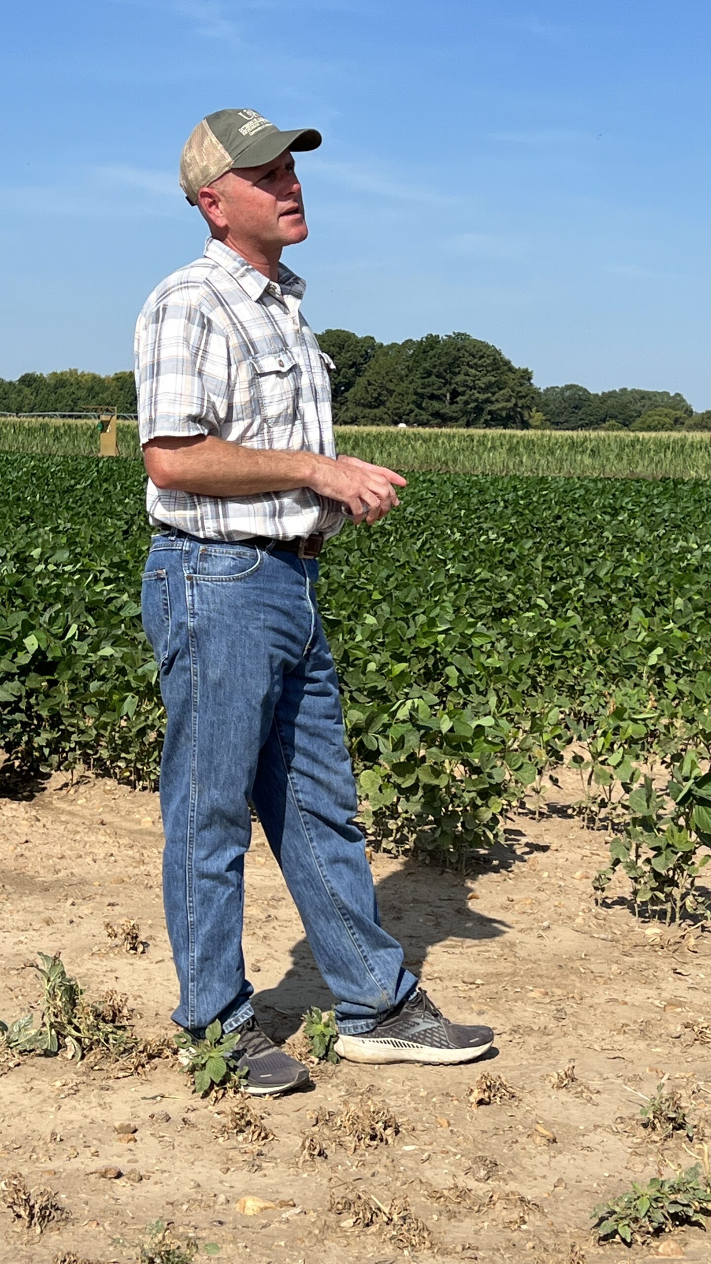 Extension Plant Pathologist Travis Faske talks about soybean disease studies at the Jackson County Extension Center. Dry weather put the kibosh on some of his work. Taken July 26, 2022. (U of A System Division of Agriculture photo by Mary Hightower)