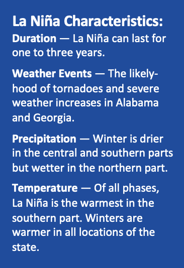 The National Weather Service has released the winter forecast and predicts climate will be under the influence of the La Niña phase of the El Niño-Southern Oscillation. ENSO is an ocean-atmospheric phenomenon that affects temperature and precipitation in the Southeast.