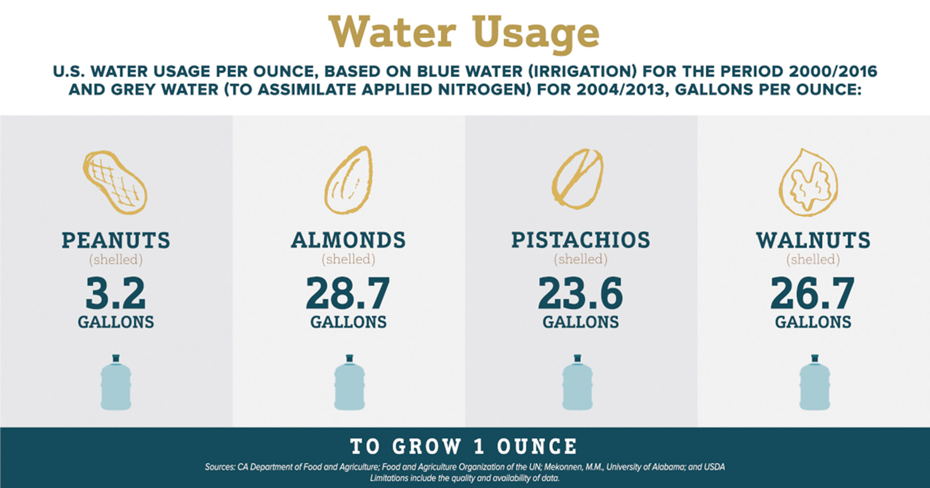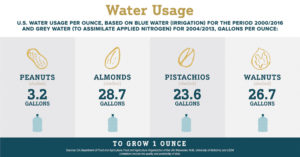 Newly released data shows that 3.2 gallons of water is used to produce one ounce of shelled peanuts. Water usage for major tree nuts has also improved but remains higher than peanuts. Almonds use 28.7 gallons; pistachios use 23.6 gallons; and walnuts use 26.7 gallons of water to grow a one ounce serving.