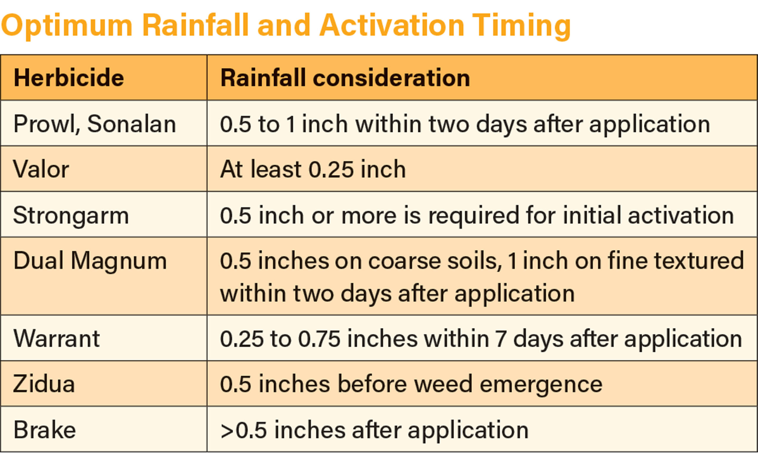 Optimum Rainfall and Activation Timing. Herbicide and their respective Rainfall consideration. Prowl, Sonalan: 0.5 to 1 inch within two days after application. Valor: At least 0.25 inch. Strongarm: 0.5 inch or more is required for initial activation. Dual Magnum: 0.5 inches on coarse soils, 1 inch on fine textured within two days after application. Warrant: 0.25 to 0.75 inches within 7 days after application. Zidua: 0.5 inches before weed emergence. Brake: >0.5 inches after application