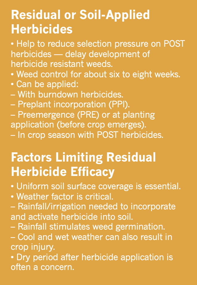 Residual herbicides can be applied with burndown herbicides, incorporated in the soil before planting, applied at planting and before emergence and even during the season with postemergence sprays.