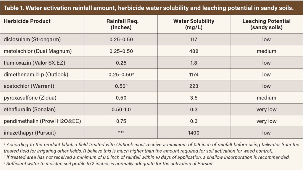 Several factors affect herbicide activation, including soil texture (sand, silt and clay), organic matter content, residue levels and temperature. In general, 0.25 to 0.50 inch is sufficient for most soil-applied herbicides within a few days of planting/application. In general, we like to see at least 1 inch in total precipitation within two weeks of a preemergence application for optimum residual activity.