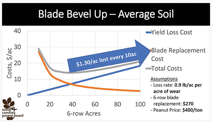 “On heavier-textured soils, there is a definite reduction in yield for every additional acre you run your digger through beyond optimal blade change. By our calculations, you will have an additional 1.7 pounds per acre of losses. While that’s not that much, it will add up.”