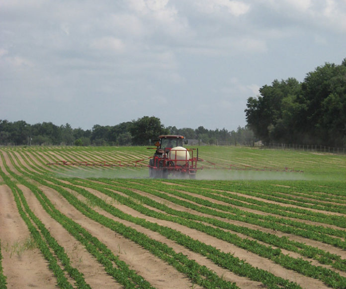 Boom sprayers are used to make broadcast applications of pesticides to large areas such as fields. Read the label before applying pesticides. Extension professionals recommend reading the label before purchasing pesticides. The pesticide label is the law, and the applicator should follow label directions. The pesticide label will tell you how much of the pesticide to apply per acre. The label will also tell the gallons of water needed per acre as recommended by the manufacturer. It is common for a pesticide label to recommend a range of 10 to 40 gallons of water per acre.