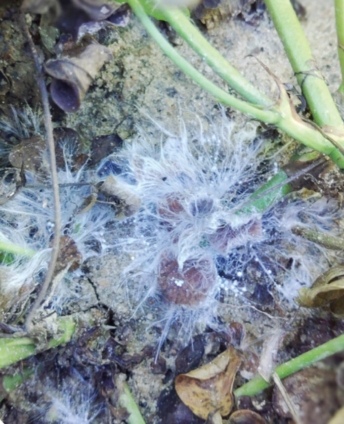 False white mold may blanket peanut stems, but it does not cause injury, Kemerait says. Real white mold produces small, round sclerotia, which false white mold does not.