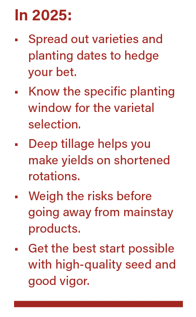 On planting date, know your varieties, and don’t go planting everything in April. Hedge your bet a bit and spread it out.”