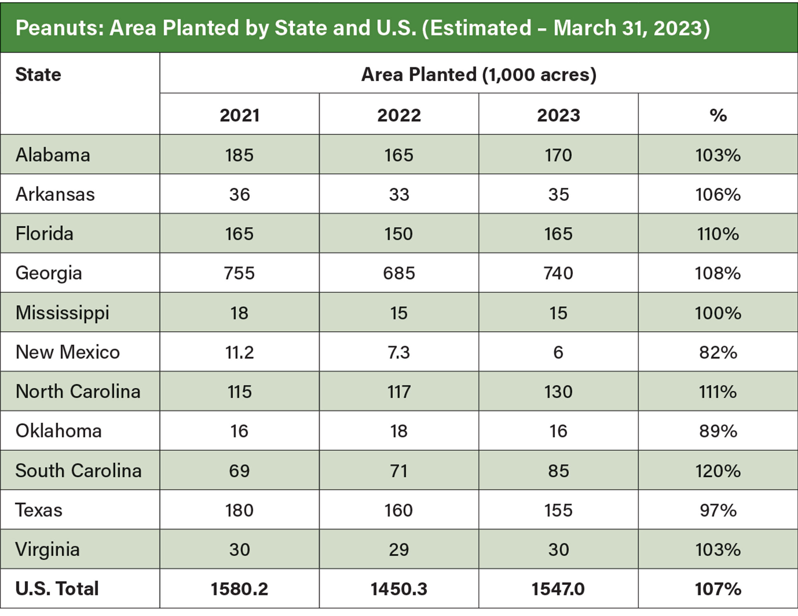 According to the Prospective Plantings report by the U.S. Department of Agriculture’s National Agricultural Statistics Service, peanut producers intend to plant 1.55 million acres in 2023, up 7% from 2022. Planted acreage is expected to be up or unchanged in all peanut-producing states except for New Mexico, Oklahoma and Texas.
