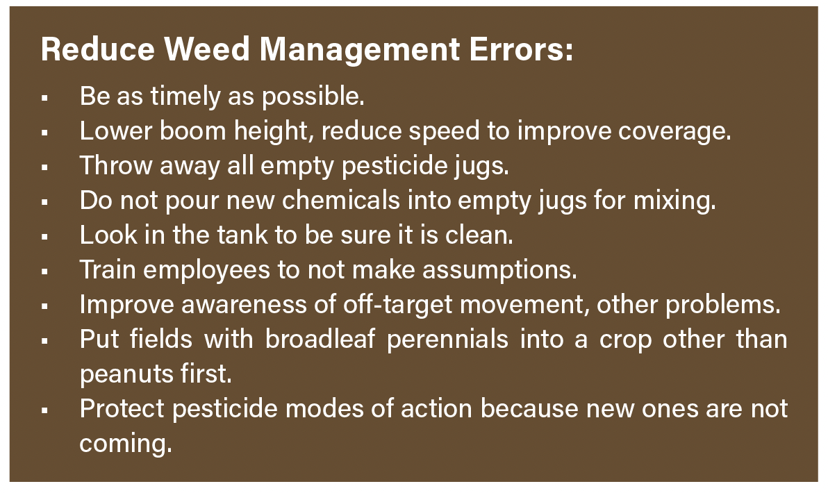 “It’s impossible to control perennial broadleaf weeds in peanuts. We don’t have herbicides that can selectively control those weeds,” he says. “We can spray glyphosate, but we’ll take the peanuts out.