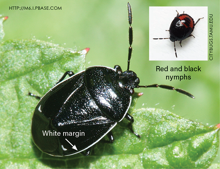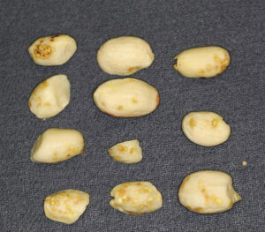 Related to stink bugs, peanut burrower bugs are “smaller than a pinky fingernail. In the family Cydnidae, they are true bugs, a specific type of insect with piercing-sucking mouth parts. Their mouths are like a hypodermic needle that pierces through the hull of the peanut to the seed — they suck the juice out of the seed,” Abney says. This results in sunken, yellowish, brown or black lesions on the peanut seed, often multiplied due to repeated feedings.