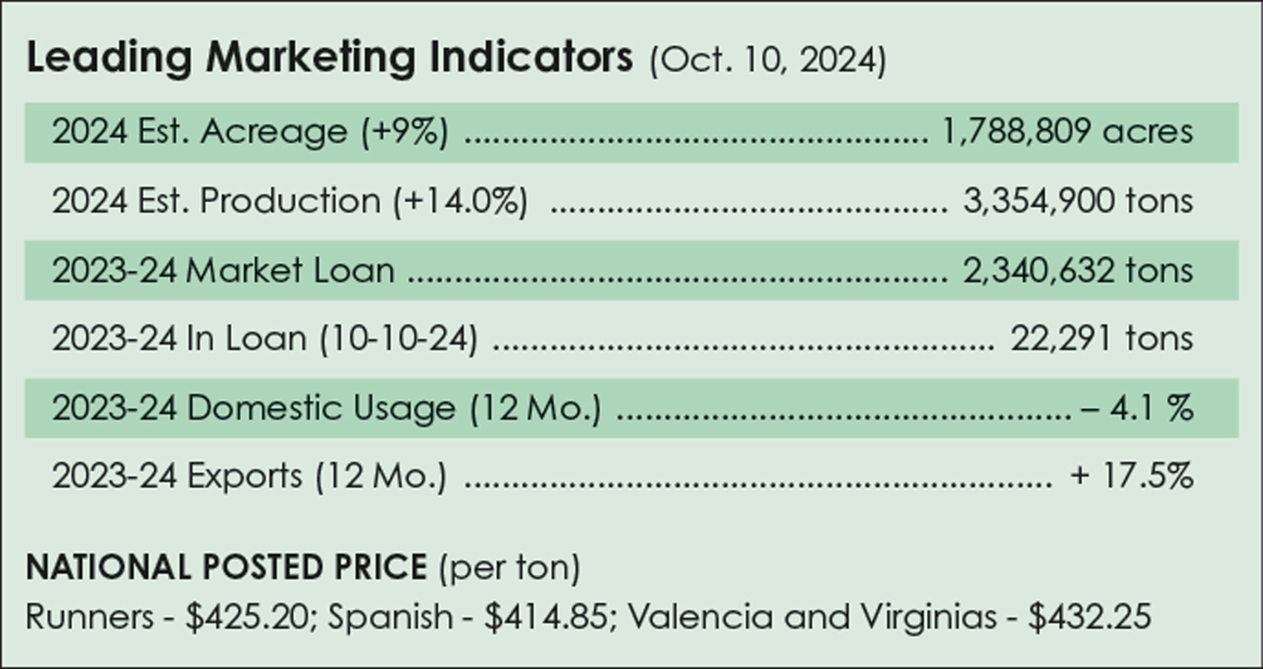 Contract offers to growers have remained at $500 to $525 per ton for runner type, if a farmer needed a guarantee to secure financing. A few perks included $25 per ton for irrigation, high-oleic varieties and hauling. Virginia-type contracts were mostly $550 to $600 per ton depending on growing area.