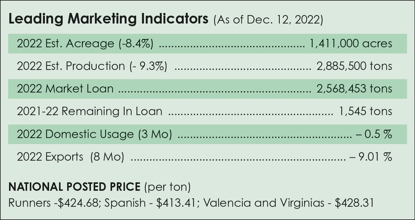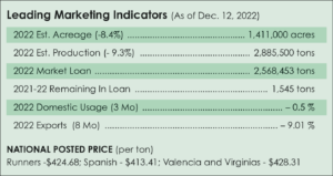 The 2022 peanut yield forecast was reduced to 4,090 pounds per acre from 4,145. Farmers reported peanut acreage at 1.4 million acres, down 8.4%. Total production was estimated at 2.88 million tons, down 9.3% from last year. The Federal State Inspection Service had graded 2.7 million tons by Dec. 9. Only 9%, or 242,531 tons, were for commercial sale at the time, and the remaining 91% was placed in the loan program for $375 per ton.