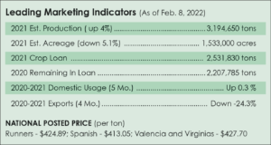 2022 farmer-stock contracts opened with $500 per ton, plus a $25 per-ton premium on seed and/or high oleic types. In the Virginia-Carolina region, contracts on Virginia-market types were offered at $500 to $520 per ton, plus a $25 per-ton premium for irrigated peanuts. The offer on runners was $475 per ton with a $25 premium for high oleics and/or irrigation.