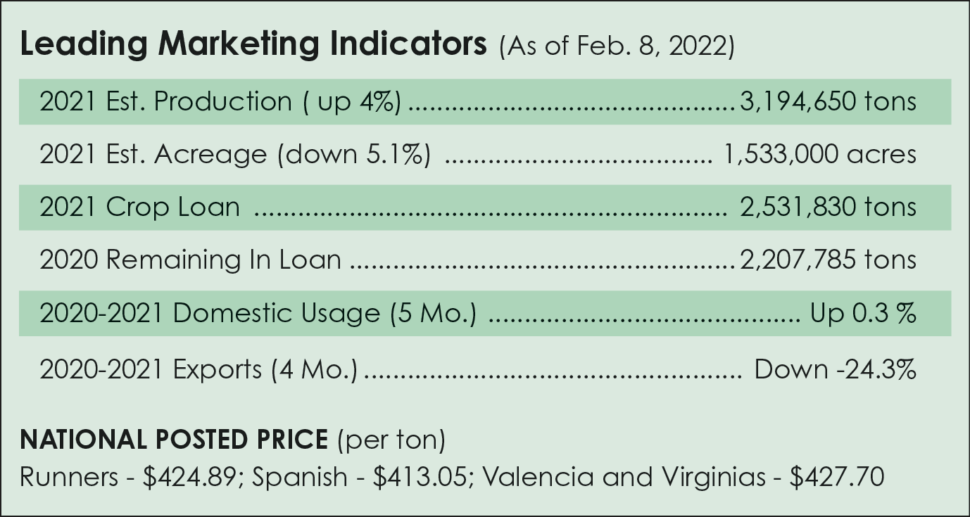 The peanut market is quiet. The U.S. domestic market is well supplied following the 2021 crop production of 3.2 million tons and approximately 1 million tons carryout.