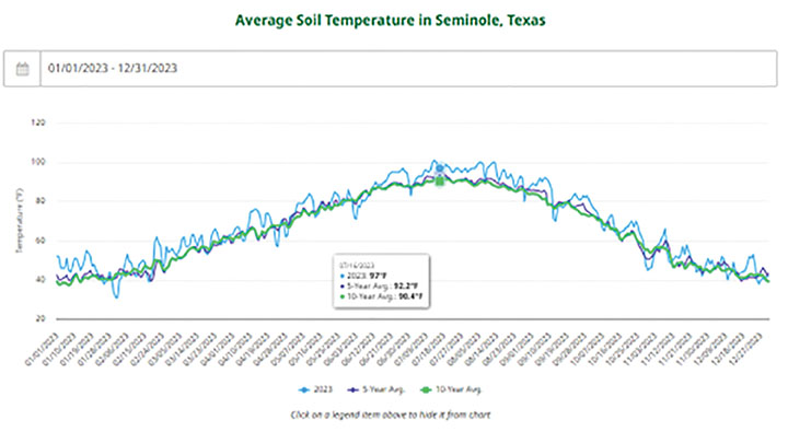 Soil temperatures in the top four inches in Seminole, Texas.