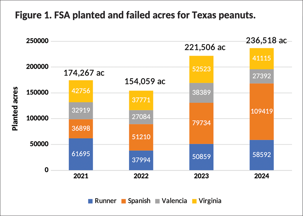 In 2024, Texas peanut acreage was up by 15,000 acres. The increased amount is especially obvious in the Spanish-market type. Ground planted to Spanish-market-type peanuts increased from 79,734 acres in 2023 to 109,419 acres in 2024 (Figure 1). This represented 87% of Spanish-market type acres in the United States.
