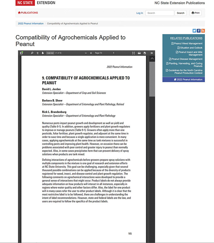 This chapter in the North Carolina Peanut Production Guide can help you make a decision on co-applying pesticides, which can be found at this website: https://bit.ly/3n6cGGs. Given all of the products on the market, this chapter seems general, but it is the start to coming up with a reasonable answer to what can be a complicated question – what will happen if I mix these products?