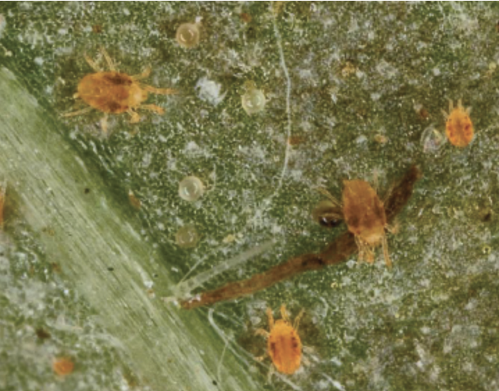 Figure 1. Twospotted spider mites on a leaf. Photo credit: David Cappeart, Bugwood